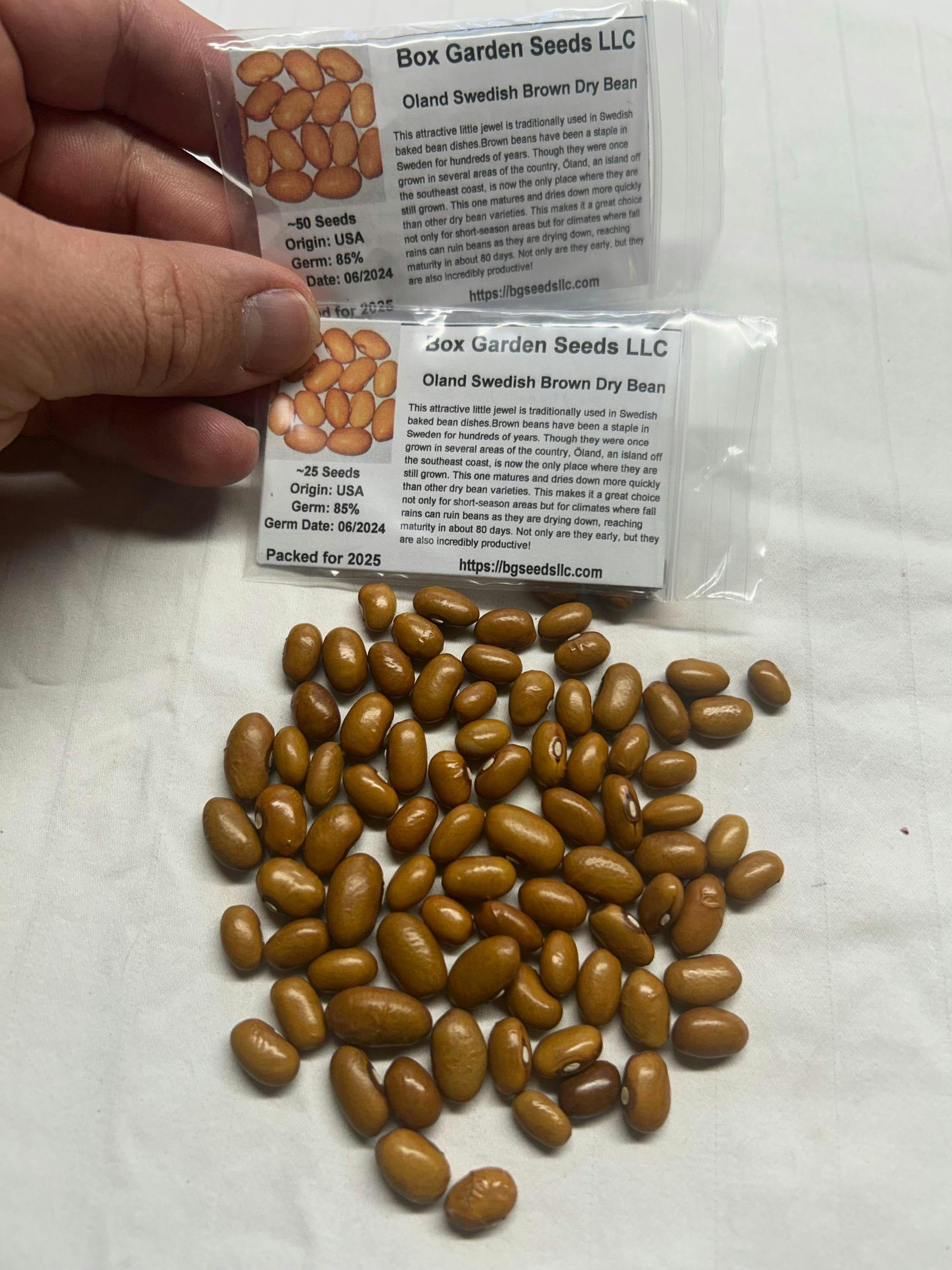 Oland Swedish Brown is one of our most popular dry beans. This attractive little jewel is traditionally used in Swedish baked bean dishes. Brown beans have been a staple in Sweden for hundreds of years. Though they were once grown in several areas of the country, Öland, an island off the southeast coast, is now the only place where they are still grown. This one matures and dries down more quickly than other dry bean varieties. This makes it an excellent choice for short-season areas and climates where fall rains can ruin beans as they dry down, reaching maturity in about 80 days. Not only are they early, but they are also incredibly productive!