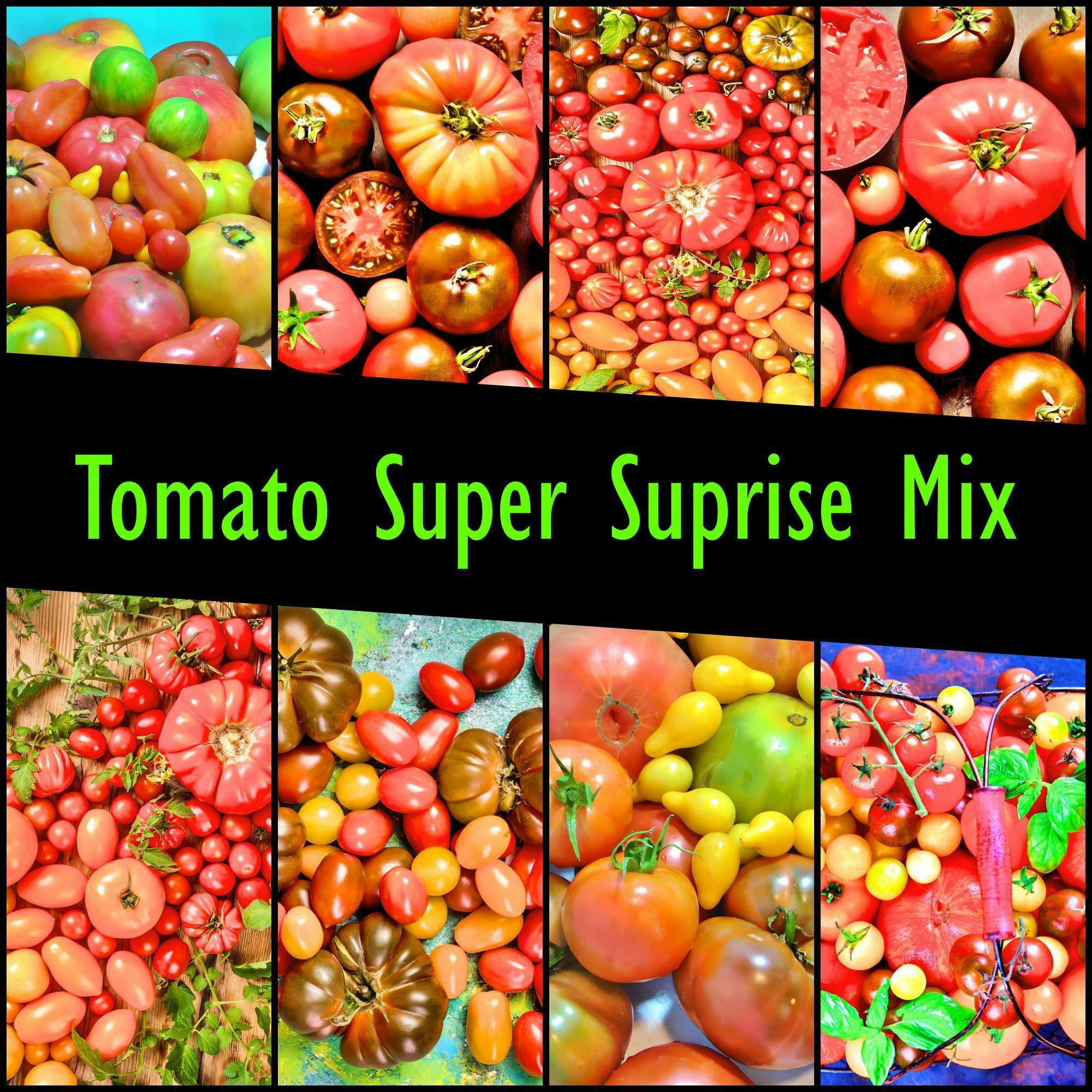 Heirloom Super Surprise Tomato Mix (just like a box of chocolates). This is a wonderful mixture of over 300 Heirloom Tomato Seeds we have grown. It is a mixture of big red, black, yellow, orange, and white beefsteak/brandy wine types with some red grape and black, red, and zebra cherry types. There are also RARE, VERY RARE, and not-so-rare types. This mix is for those who can't make up their mind about what to grow. Or they are like me and want to grow them all. Plant some and save the seed from your favorites to plant next year. Basically, it is a mixture of all the tomatoes I have ever grown and am growing.