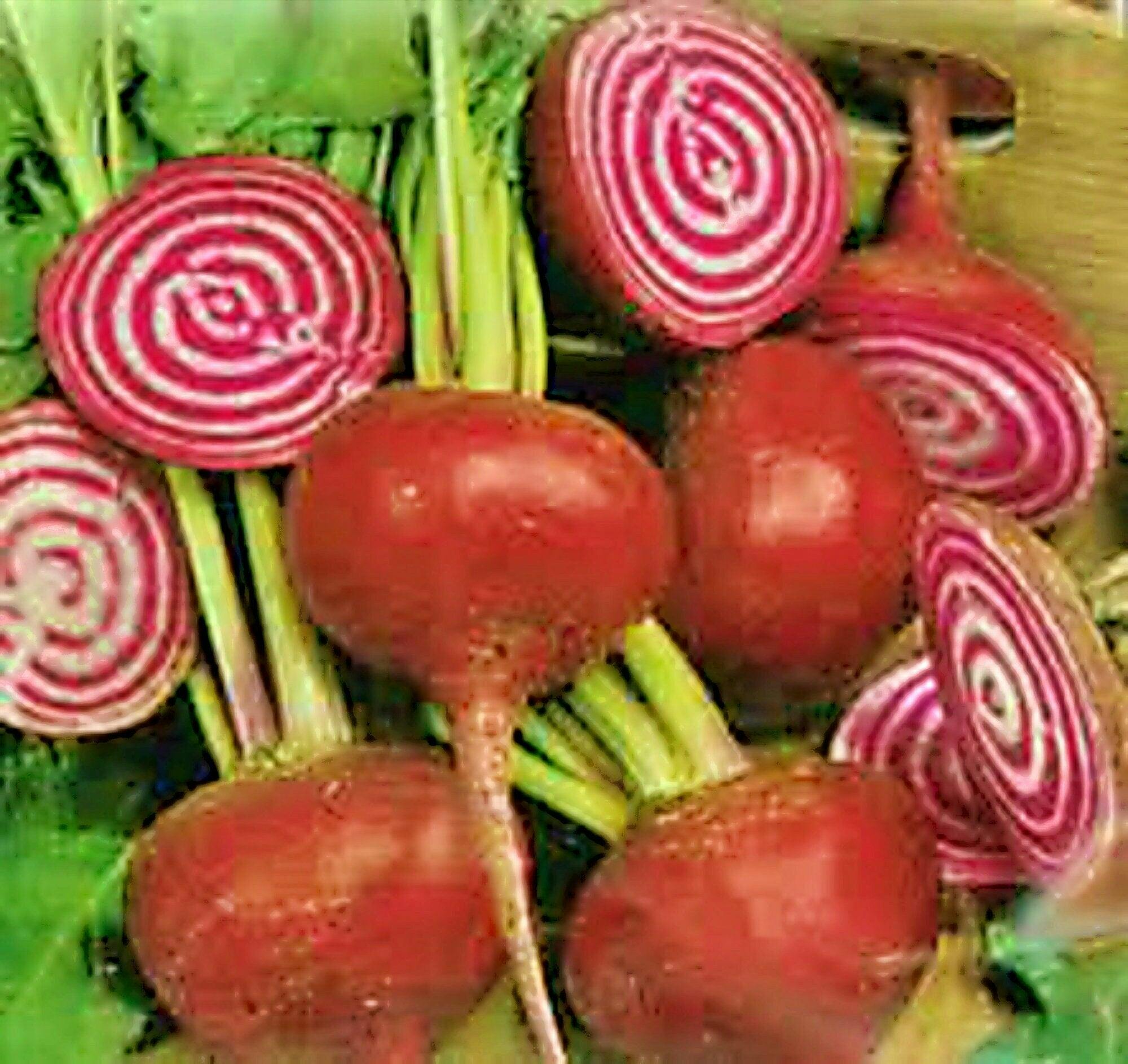 Chioggia Heirloom Beet Seeds. Also known as the Candy Cane Beet or the Bullseye Beet, this heirloom beet originates from the coastal town of Chioggia in Northern Italy near Venice. Tops are green with a pink striped stem, while the roots are cherry red on the outside and reveal alternating rings of white and deep pink when sliced, but the color fades when cooked. The flavor is a little sweeter than purple beets. 55 days