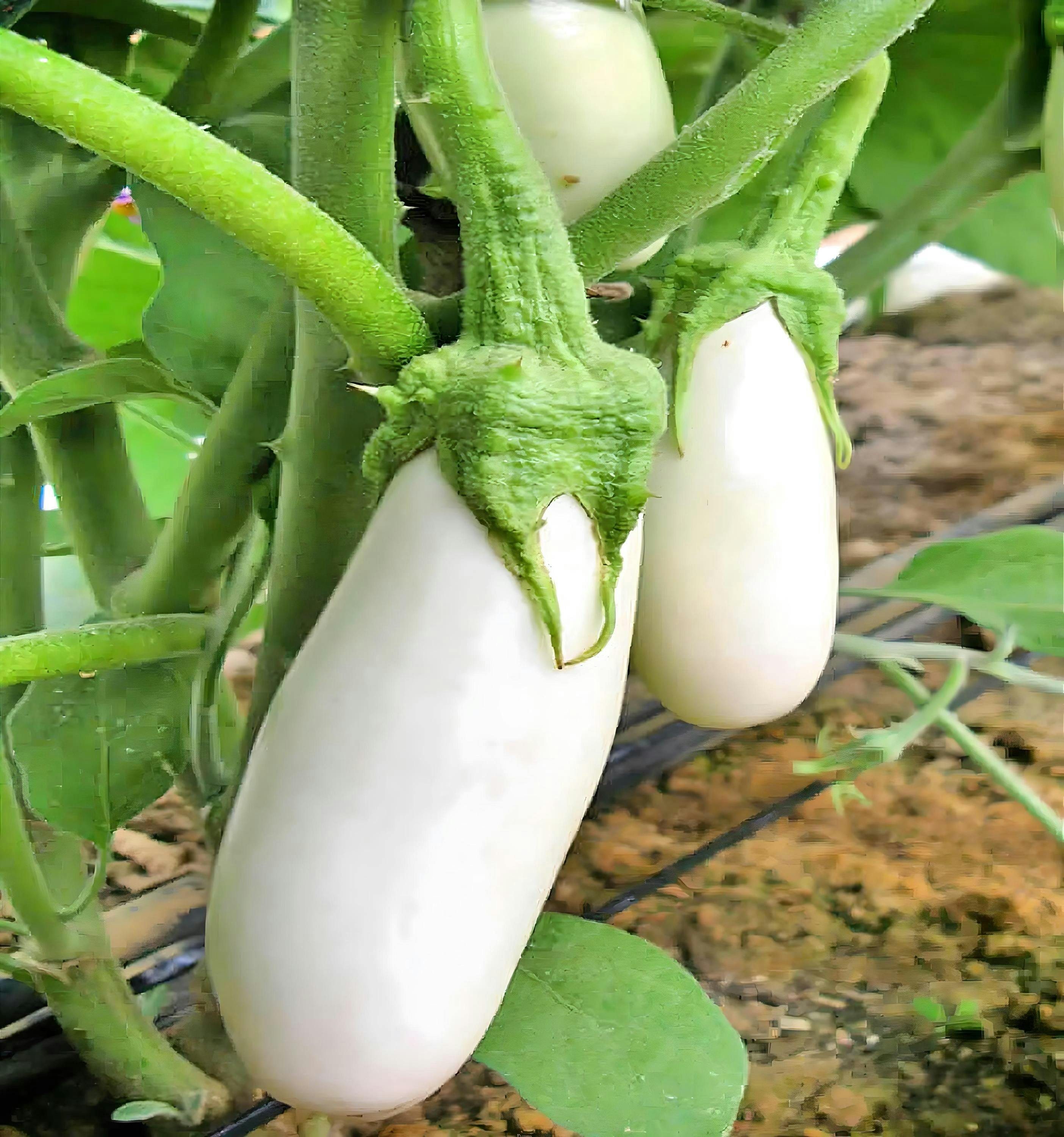 Snowy Eggplant (Solanum melongena) can be grown in containers. Snowy Eggplant is long ivory-white with a mild flavor with no bitterness. The unique ivory-white color of a warm-season tender annual makes it a standout variety. With uniform, 7" long ivory fruits that are firm and meaty, it holds up well in cooking where others may turn to mush. It can be adapted to containers with limited garden space or short growing seasons. 60 - 65 days to maturity.